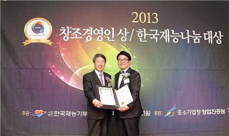 백남선(오른쪽) 이대여성암병원장이 지난 2일 열린 '2013 창조경영인 대상 시상식'에서 서울시장 표창을 받은 후 정운찬 한국재능기부협회 명예이사장과 기념사진을 촬영하고 있다.