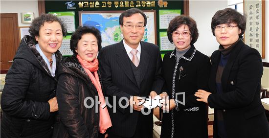대한주부교실 고창지회 회원들이 고창군에 150만원을 기탁하고 이강수 고창군수와 기념촬영을 하고있다.