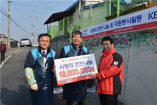 최계운 수자원공사 사장(가운데)이 사랑의 연탄나누기 행사를 통해 성금을 전달하고 있다.