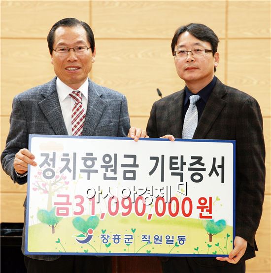 이명흠 장흥군수(왼쪽)가 장흥군선거관리위원회 채성수 사무국장에게 정치발전기금을 전달하고 기념촬영을 하고 있다.