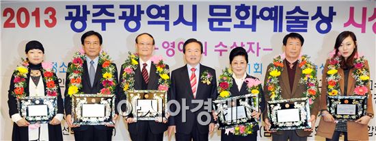 [아시아경제 노해섭 기자]강운태 광주광역시장은 4일 오후 라마다호텔에서 2013 광주문화예술상 시상식을 갖고 수상자들과 가념촬영을 하고 있다. (왼쪽부터 오지호미술상 특별상 주라영 조각가, 오지호 미술상 본상 서승원 서양화가, 정소파 문학상 오재열시인,강운태 광주광역시장,임방울국악상 이성림 국악인, 허백련 미술상 본상 김재일 화가, 허백련 미술상 특별상 이선희화가)노해섭 기자 nogary@<ⓒ세계를 보는 창 경제를 보는 눈, 아시아경제(www.asiae.co.kr) 무단전재 배포금지>