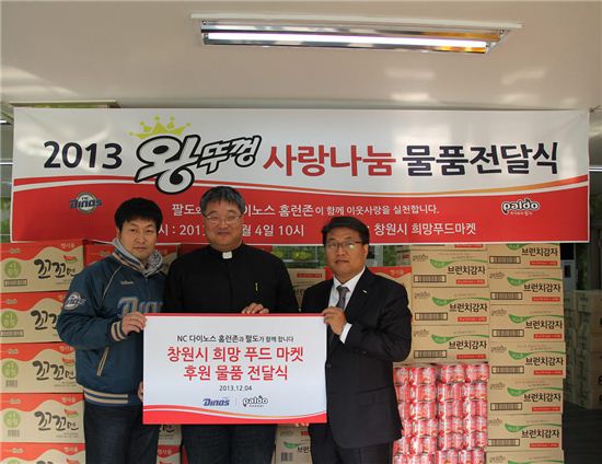 왼쪽부터 손성욱 NC 다이노스 마케팅팀 팀장, 박철현 창원시 희망 푸드마켓 관장, 황대성 팔도 경남지점 지점장[사진=NC 다이노스 제공]