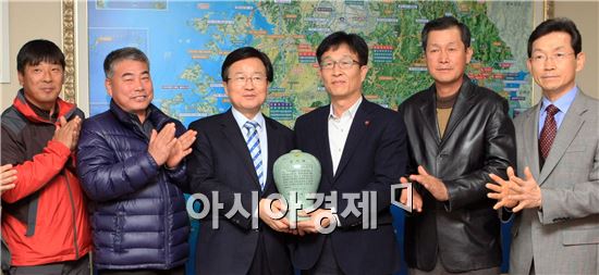 [아시아경제 노해섭 기자]배용태 전남도 행정부지사(왼쪽 세 번째)가 5일 집무실에서 이마트 내 로컬푸드 직매장을 개설, 지역농수특산물 판매에 기여한 (주)이마트(대표 허인철)에 대한 감사패를 민영선 상무에게 전달한 뒤 참여농가 대표들과 기념촬영을 하고 있다. 사진제공=전남도노해섭 기자 nogary@ <ⓒ세계를 보는 창 경제를 보는 눈, 아시아경제(www.asiae.co.kr) 무단전재 배포금지>
