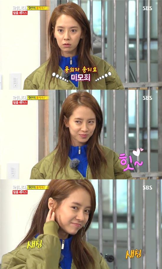 [아시아경제 최준용 기자]송지효 미모죄송지효가 미모죄를 받았다.송지효는 9일 방송된 SBS '일요일이좋다-런닝맨'에서 제작진으로부터 미모죄를 부여받았다. 송지효는 '미모죄'라는 말에 새침한 표정으로 기쁨을 표현했다.'런닝맨' 멤버들은 송지효 미모죄에 거세게 항의했다. 하지만 송지효와 월요커플인 개리만은 "죄긴 죄다. 내 마음을 훔쳤으니까"라고 송지효 미모죄에 동의했다.한편 이날 유재석은 춤바람죄, 이광수는 과도한 상황극죄, 배신죄, 불우죄, 겁상실죄 등을 받았다. 게스트 박희순은 카리스마죄, 공유는 10대부터 50대 나이를 막론하고 여성들의 마음에 불을 질렀다는 방화죄를 받았다.송지효 미모죄 장면을 접한 네티즌은 "송지효 미모죄, 정말 예쁜듯" "송지효 미모죄, 인정" "송지효 미모죄, 개리도 동의했다" "송지효 미모죄, 새침한 모습도 예쁘다"라고 뜨거운 반응을 보였다.최준용 기자 cjy@asiae.co.kr<ⓒ세계를 보는 창 경제를 보는 눈, 아시아경제(www.asiae.co.kr) 무단전재 배포금지>