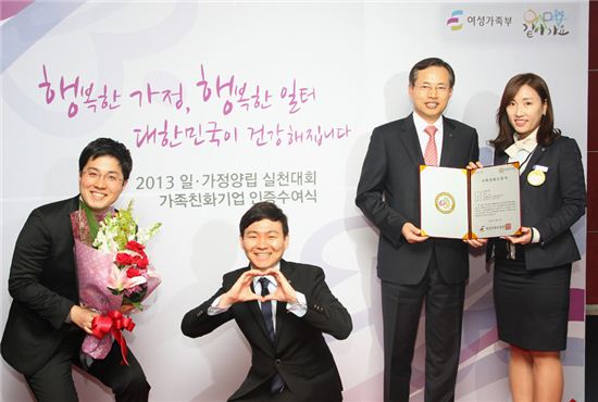 [아시아경제 김철현 기자] 신한은행은 '2013년도 가족친화기업 인증'을 받았다고 10일 밝혔다. 2008년부터 시행되고 있는 '가족친화기업 인증제'는 가정생활에 친화적인 제도를 모범적으로 운영하고 있는 기업이나 기관을 대상으로 여성가족부 장관이 인증을 부여하는 제도다.신한은행은 매주 수요일과 금요일 정시퇴근을 제도화하고 근무시간 정상화를 통해 자기계발 및 가족과 함께하는 시간 확대를 위해 노력하고 있다. '산림 치유 자연 나눔' 힐링 프로그램을 비롯해 가족과 함께하는 다양한 취미활동 프로그램도 진행하고 있다. 특히 신한은행은 2010년부터 전 직원이 연중 10일 이상 연차휴가를 의무적으로 사용하는 웰프로(Wel-Pro) 휴가제도를 실시하고 있다. 신한은행 관계자는 "가족친화기업 인증을 계기로 관련 제도와 프로그램을 더욱 발전시켜 직원들이 일과 가정에서 균형을 이룰 수 있도록 하겠다"고 말했다.김철현 기자 kch@asiae.co.kr<ⓒ세계를 보는 창 경제를 보는 눈, 아시아경제(www.asiae.co.kr) 무단전재 배포금지>