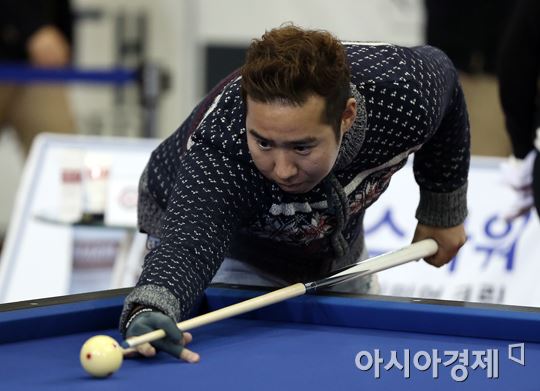 [아시아경제 정재훈 기자] 11일 서울 노원구 상명고등학교 체육관에서 열린 제2회 프로야구선수 3쿠션 당구대회. 두산 유희관이 경기에 임하고 있다.정재훈 기자 roze@asiae.co.kr<ⓒ세계를 보는 창 경제를 보는 눈, 아시아경제(www.asiae.co.kr) 무단전재 배포금지>