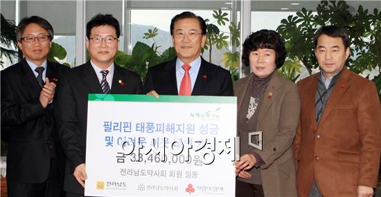 [아시아경제 노해섭 기자]전라남도 약사회 이태식 회장(왼쪽 두 번째)이 11일 오후 전남도를 방문, 박준영 전남도지사에게 연말연시를 맞아 도내 사회복지시설에 전달할 따뜻한 겨울내의 600벌(2200만원 상당)과 필리핀 태풍피해 지원 성금 1100만원을 기탁하고 있다. 사진제공=전남도노해섭 기자 nogary@<ⓒ세계를 보는 창 경제를 보는 눈, 아시아경제(www.asiae.co.kr) 무단전재 배포금지>
