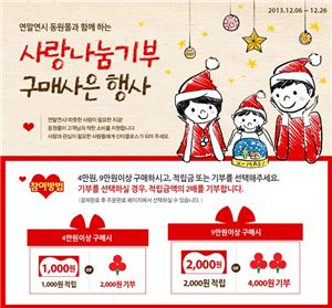 [아시아경제 이광호 기자]동원F&B에서 운영하는 식품전문쇼핑몰 동원몰(www.dongwonmall.com)이 이달 26일까지 일정금액 이상 구매 고객을 대상으로 하는 착한소비 행사인 '사랑나눔 기부행사'를 진행한다거 12일 밝혔다. 이 기간 동안 동원몰에서 1회 결제액 기준 4만원 이상 구매한 고객은 1000원의 포인트 적립과 기부 중 원하는 것을 선택할 수 있으며, 9만원 이상 구매한 고객은 2000원의 포인트 적립과 기부 중 선택할 수 있다. 고객이 적립 대신 기부를 선택할 경우 동일한 금액을 동원몰에서 함께 기부하게 된다. 모인 기부금은 사랑의 열매(사회복지공동모금회)에 전달될 예정이다. 동원몰 관계자는 "연말을 맞아 착한 소비를 통해 작으나마 어려운 이웃을 도울 수 있는 기회를 마련하고자 기획하게 됐다"고 말했다.이광호 기자 kwang@asiae.co.kr<ⓒ세계를 보는 창 경제를 보는 눈, 아시아경제(www.asiae.co.kr) 무단전재 배포금지>