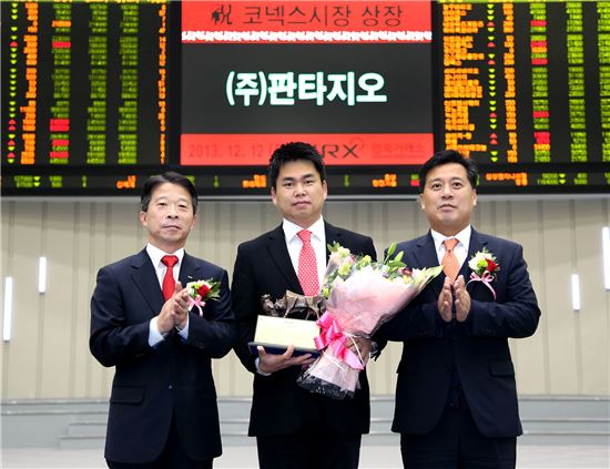 [아시아경제 김유리 기자]한국거래소 코스닥시장본부는 12일 오전 거래소 서울사옥 홍보관에서 연예 매니지먼트 전문회사인 판타지오의 코넥스시장 상장기념식을 개최했다. 왼쪽부터 최홍식 거래소 코스닥시장본부장, 나병준 판타지오 대표, 신명호 하나대투증권 본부장.김유리 기자 yr61@asiae.co.kr<ⓒ세계를 보는 창 경제를 보는 눈, 아시아경제(www.asiae.co.kr) 무단전재 배포금지>