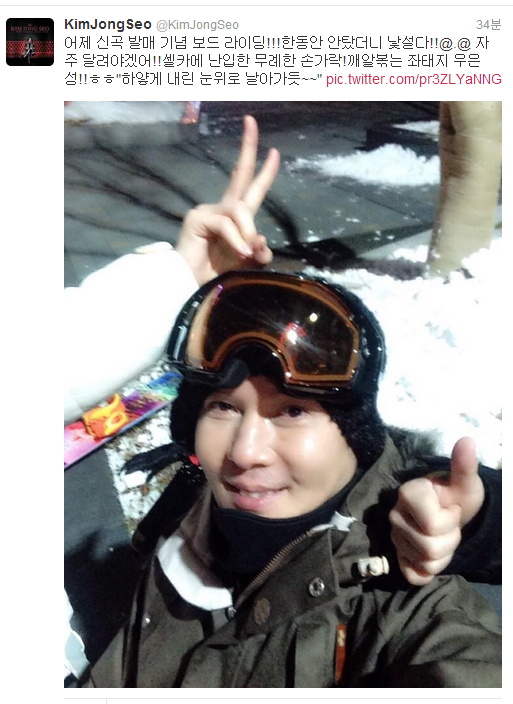 [아시아경제 박건욱 기자]가수 김종서가 서태지 부부와 함께한 인증샷을 공개했다. 김종서는 12일 오후 자신의 트위터에 "어제 신곡 발매 기념 보드 라이딩! 한동안 안탔더니 낯설다! 자주 달려야겠어! 셀카에 난입한 무례한 손가락! 깨알 볶는 좌태지 우은성! 하얗게 내린 눈 위로 날아가듯~"이라는 글과 함께 한 장의 사진을 공개했다.공개된 사진에는 셀카를 찍는 김종서 주위로 주인을 알 수 없는 두 사람의 손이 함께 등장한다. 김종서가 남긴 '좌태지 우은성'이라는 멘트로 미뤄볼 때 정체모를 손의 주인공은 서태지와 이은성 부부로 추측된다. 김종서의 인증샷을 접한 네티즌들은 "태지형 손가락 깜짝 등장", "가고 싶다. 어디예요?", "정말 깨알 친분인증이네"라며 다양한 반응을 나타냈다. 한편 김종서는 지난 11일 2년 만에 신곡 '아프다'를 발표하고 본격적인 활동에 나설 예정이다. 박건욱 기자 kun1112@asiae.co.kr<ⓒ아시아경제 & 스투닷컴(stoo.com)이 만드는 온오프라인 연예뉴스>