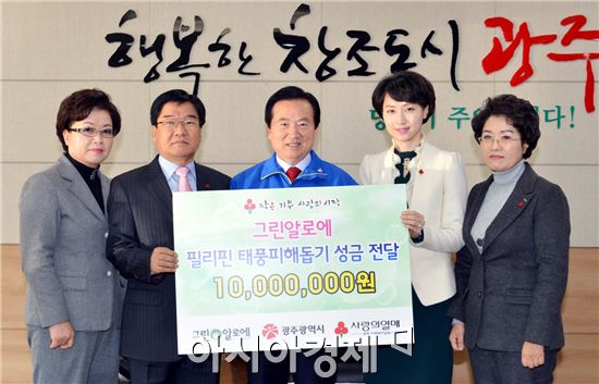 "필리핀 태풍 피해 돕기 1000만원 기탁"[아시아경제 노해섭 기자]광주광역시(시장 강운태)는 (주)그린알로에(대표 정광숙)가 불우이웃을 돕기 성금 1000만원을 기탁했다고 12일 밝혔다.이번 성금은 지난달 태풍 하이엔으로 피해를 입은 필리핀을 돕기 위한 것으로, 광주사회복지공동모금회는 지난달 21일부터 필리핀 태풍피해 돕기 성금을 모금해 왔다. ㈜그린알로에는 지난 2011년부터 3억원 상당의 자사 제품과 현금 5600만원을 광주사회복지공동모금회에 기부해 왔다.정수택 사회복지과장은 “32억원을 목표로 희망2014나눔캠페인이 열리고 있다”며 “기업과 학교, 시민들이 많은 관심을 갖고 참여해주기를 바란다”고 말했다.노해섭 기자 nogary@<ⓒ세계를 보는 창 경제를 보는 눈, 아시아경제(www.asiae.co.kr) 무단전재 배포금지>
