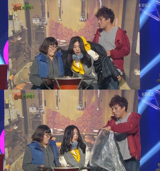 [아시아경제 스포츠투데이 장용준 인턴기자]개그우먼 김나희가 넘치는 매력으로 좀비를 매혹시켰다.김나희는 최근 방송한 KBS2 '개그콘서트'의 '좀비 프로젝트' 코너에 출연해 좀비로 분한 정태호를 매혹시켜 웃음을 자아냈다.이날 김준호와 정태호는 좀비로 분해 고깃집에서 아르바이트하는 모습을 그려냈다. 김나희와 조수연은 그 가게에 온 손님 역할이었다. 정태호는 김나희의 외모에 반한 표정으로 그의 외투를 벗기는 돌발행동을 보였다.김나희는 놀라는 표정을 지었고, 정태호는 "고기 냄새가 밴다"며 좀비답지 않은 친절함으로 주위를 웃음바다로 만들었다.이 방송을 접한 네티즌들은 "김나희 너무 예쁘다" "김나희 옆에서 나도 좀비가 되고 싶다" "김나희와 같이 고기 먹고 싶다" 등 다양한 반응을 보였다.장용준 인턴기자 zelra@asiae.co.kr<ⓒ세계를 보는 창 경제를 보는 눈, 아시아경제(www.asiae.co.kr) 무단전재 배포금지>