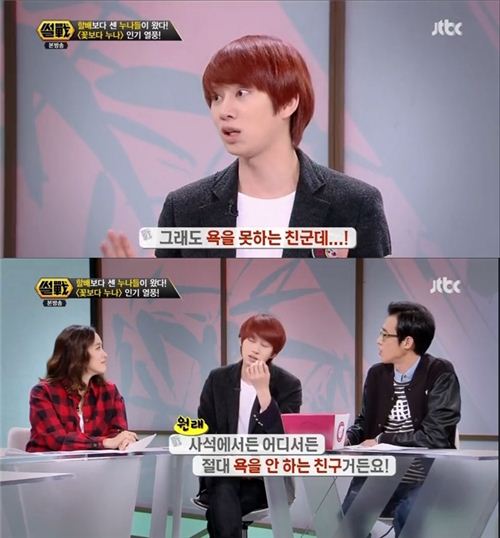 [아시아경제 e뉴스팀]이승기 욕그룹 슈퍼주니어 멤버 김희철이 이승기의 욕을 듣고 깜짝 놀랐다고 밝혔다.김희철은 지난 12일 오후 방송된 종합편성채널 JTBC '썰전'에서 '꽃보다누나 인기열풍'이라는 주제로 설전을 펼치던 중 "'꽃보다 누나'에서 이승기가 '나 너무 병신 같지?'라고 욕하는 장면을 보고 깜짝 놀랐다"고 고백했다.특히 이날 그는 "이승기는 사석에서도 욕을 절대 안 한다"며 "이승기에게 '욕해봐'라고 해도 안 한다"고 덧붙였다.이에 김구라는 "20세 이상 성인이 동료한테 욕을 시키는 게 할 일이냐"고 주위를 웃음바다로 만들었다. 이승기의 욕을 접한 네티즌들은 "이승기 욕 정말 안하나?" "이승기 욕 안한다고? 역시 엄친아" "이승기 욕 들어보고 싶다" 등 다양한 반응을 보였다. e뉴스팀 ent@asiae.co.kr<ⓒ아시아경제 & 스투닷컴(stoo.com)이 만드는 온오프라인 연예뉴스>