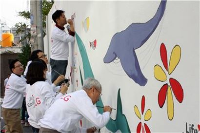 LG전자 임직원들이 서울 금천구 독산동 지역에서 벽화를 직접 그리고 있다.