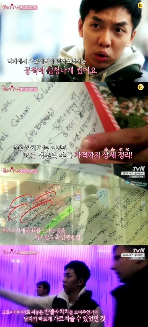 [아시아경제 스포츠투데이 장용준 인턴기자]'꽃보다 누나' 이승기의 활약 비결은 꼼꼼한 노력으로 작성한 비밀노트였다.13일 오후 방송한 케이블채널 tvN 예능프로그램 '꽃보다 누나'에서 이승기는 크로아티아 여행을 위해 꼼꼼하게 작성해 놓은 비밀 노트를 공개했다. 프로그램 내내 그의 활약 비결은 바로 이것이었다.이날 이승기와 '누나'들은 크로아티아에 도착했다. 이들이 가장 먼저 수행해야 하는 미션은 바로 숙소를 찾는 것이었다.이승기는 '누나'들을 위해 솔선수범에 나섰다. 그는 대중교통을 이용하기 위해 생전 처음 와보는 타지에서 발로 뛰어 티켓을 구입해 일행들을 목적지로 안내했다.비록 그는 애쓴 만큼 매끄러운 결과를 만들지는 못 했지만, 책임감을 갖고 앞장서는 모습은 지켜보는 이들의 뿌듯함을 자아내기에 부족함이 없었다.그리고 그런 이승기가 작성한 비밀 노트가 공개됐다. 그는 공항에 도착하는 순간부터 숙소에 이르기까지의 과정을 미리 생각해놨던 것이다. 이승기가 전차 매표소를 빨리 찾은 비결도, 목적지로 가는 방법을 정확하게 물어볼 수 있었던 능력도 모두 철저한 준비 덕분이었다.그는 '누나'들을 이끄는 가이드로서 아직도 많이 미숙한 모습을 보이고 있지만, 조금씩 성장해가는 모습과 이를 가능케 하는 숨은 노력들은 시청자들의 감탄을 자아낼 만했다. 장용준 인턴기자 zelra@asiae.co.kr<ⓒ세계를 보는 창 경제를 보는 눈, 아시아경제(www.asiae.co.kr) 무단전재 배포금지>