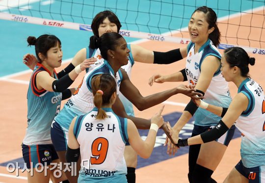 [수원=아시아경제 정재훈 기자] 17일 오후 수원실내체육관에서 열린 NH농협 2013-2014 V리그 여자부 현대건설과 GS칼텍스의 경기. GS칼텍스 베띠가 서브 에이스를 기록하고 동료들의 축하를 받고 있다.정재훈 기자 roze@asiae.co.kr<ⓒ세계를 보는 창 경제를 보는 눈, 아시아경제(www.asiae.co.kr) 무단전재 배포금지>정재훈 사진기자 roze@asiae.co.kr<ⓒ아시아 대표 석간 '아시아경제' (www.newsva.co.kr) 무단전재 배포금지>