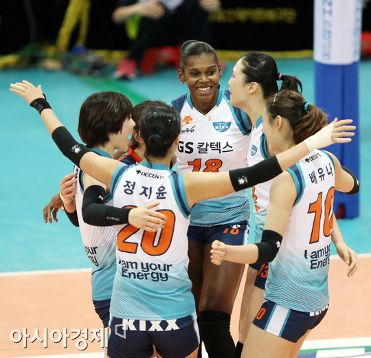 [수원=아시아경제 정재훈 기자] 17일 오후 수원실내체육관에서 열린 NH농협 2013-2014 V리그 여자부 현대건설과 GS칼텍스의 경기. GS칼텍스 선수들이 득점에 기뻐하고 있다.정재훈 기자 roze@asiae.co.kr<ⓒ세계를 보는 창 경제를 보는 눈, 아시아경제(www.asiae.co.kr) 무단전재 배포금지>정재훈 사진기자 roze@asiae.co.kr<ⓒ아시아 대표 석간 '아시아경제' (www.newsva.co.kr) 무단전재 배포금지>
