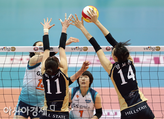 [수원=아시아경제 정재훈 기자] 17일 오후 수원실내체육관에서 열린 NH농협 2013-2014 V리그 여자부 현대건설과 GS칼텍스의 경기. 현대건설 양효진이 GS칼텍스 정대영의 스파이크를 블로킹하고 있다.정재훈 기자 roze@asiae.co.kr<ⓒ세계를 보는 창 경제를 보는 눈, 아시아경제(www.asiae.co.kr) 무단전재 배포금지>정재훈 사진기자 roze@asiae.co.kr<ⓒ아시아 대표 석간 '아시아경제' (www.newsva.co.kr) 무단전재 배포금지>
