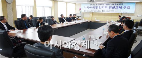 “아시아태평양지역 평화체제 구축이라는 주제로 열띤 토론 이어져”[아시아경제 노해섭 기자]전남대학교 아시아태평양지역연구소(소장 윤성석)와 정치외교학과(학과장 김재기) 공동으로 주최하는 호남국제정치학회 연례학술회의가 18일 오후 “아시아태평양지역 평화체제 구축”이라는 주제로 전남대 사회대 교수 회의실에서 열렸다. 이날 제1패널에서는 최근 벌어지고 있는 아시아태평양지역에서의 패권경쟁과 관련해 “한국군 평화활동 20년 평가와 전략적 대응”(박순향, 국방대학교), “중국 군사전략 변화의 함의”(이상택, 원광대학교), “동아시아태평양지역에서 해양영토분쟁 고찰”(주종광, 전남대)이라는 주제로 발표가 있었다.제2패널에서는 “북한 군사협상 모델 분석을 통한 일반협상 적용에 관한 연구”(이성춘, 조선이공대학교), “북한 김정은 체제 2년 평가와 전망”(이지경, 공군사관학교)이라는 주제로 발표가 있었다.제3패널에서는 “일본 아베정권의 보수 우경화 정책”(이성대, 광주남구청), “독도문제해결을 위한 전략 모색”(이진, 민주당)이라는 주제로 발표회를 가졌다.오늘 발표한 주제는 현재 한반도주변을 둘러싸고 있는 북한문제와 국제정세에 대하여 학계전문가들의 심도있는 발표와 열띤 토론이 있었다.학술대회를 주최한 호남국제정치학회 회장인 윤성석(전남대교수)는 “최근 북한문제와 중국의 부상, 일본의 군사대국화 등 아시아태평양 지역은 그 어느 때보다도 중요시기다”며 “아시아태평양지역 평화체제 구축이라는 주제를 채택해 학술대회를 개최하게 되었다”고 말했다.노해섭 기자 nogary@<ⓒ세계를 보는 창 경제를 보는 눈, 아시아경제(www.asiae.co.kr) 무단전재 배포금지>