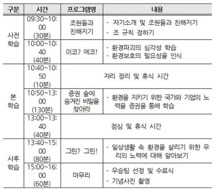 [아시아경제 김유리 기자]한국예탁결제원(KSD) 증권박물관은 겨울방학을 맞이해 초등학교 3학년에서 6학년을 대상으로 겨울방학 특별프로그램 '이코! 에코! 증권탐험대Ⅱ'를 개최한다고 19일 밝혔다. 내년 1월14일부터 16일까지 3회에 걸쳐 실시되는 이번 프로그램은 어린이들에게 '경제가 곧 환경'이라는 인식을 심어주고자 마련됐다. 참가한 어린이들은 친환경적 경제성장을 위한 국가와 기업의 다양한 노력을 강의와 미션수행을 통해 학습하게 된다. 또한 일상생활 속 환경을 보호하기 위한 실천과제를 제시해 어린이들의 작은 노력이 국가 경제를 살릴 수 있음을 알려줄 계획이다. 무상으로 진행되는 이번 프로그램의 참가신청은 19일 오전 9시부터 내년 1월2일 오후 5시까지 증권박물관 홈페이지()에 게시된 참가 신청서를 다운로드 받아 이메일(museum@ksd.or.kr)로 접수하면 된다. 참가자는 추첨을 통해 내년 1월7일 오후 3시 이후 증권박물관 홈페이지를 통해 발표할 예정이다.