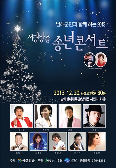 [아시아경제 조은임 기자] 서경방송이 오는 20일 오후 6시30분 남해실내체육관에서 2013 송년 콘서트를 개최한다고 19일 밝혔다. 서경방송이 주최하고 남해군이 후원하는 이번 행사에는 송대관, 강진, 육각수 등 20여명 출연한다. 행사장에는 누구나 무료로 입장할 수 있으며, 서경방송은 지역채널 8번을 통해 생중계할 예정이다. 조은임 기자 goodnim@asiae.co.kr<ⓒ세계를 보는 창 경제를 보는 눈, 아시아경제(www.asiae.co.kr) 무단전재 배포금지>