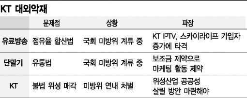 [아시아경제 심나영 기자]유료방송 점유율 합산법, 단말기 유통법, KT 위성 매각 논란.황창규 KT CEO 내정자를 압박하는 대외 악재는 첩첩산중이다. 방송과 통신 부문에서 엇갈린 이해관계로 인한 갈등이 이어지는 가운데 위성 매각의 후폭풍도 만만찮다. KT를 둘러싼 대외 악재는 황 내정자의 리더십을 평가하는 시험 무대가 될 것이다.19일부터 국회 미래창조과학방송통신위원회 법안심사 소위는 유료방송 점유율 합산법을 논의한다. KT IPTV와 KT 계열사인 KT스카이라이프의 가입자 확장의 발목을 잡을 수 있는 법안이기 때문에 KT의 사활이 걸려있다. 방송법 개정안(홍문종 새누리당 의원 발의)은 그간 종합유선방송사업자(MSO)와 달랐던 점유율 규제를 IPTV와 위성방송에도 동일하게 적용해 가입자를 전체 유료방송의 3분의 1로 제한하는 내용이다. IPTV법 개정안(전병헌 민주당 의원)도 IPTV사업자의 시장 점유율을 계산할 때 위성방송 사업자를 포함해 KT가 불이익을 받게 된다.KT IPTV와 위성방송이 전체 유료방송 시장에서 점유율 32%를 차지할 정도로 성장동력인 것을 감안하면 황 내정자의 조정 능력에 눈길이 쏠린다. KT는 시장 점유율 규제시 위성방송 서비스가 필요한 사람들이 정작 가입을 못할 수 있고, IPTV와 위성방송 서비스를 결합한 신서비스가 만들어질 수 없다는 논리로 반대하고 있지만 상황이 녹록치 않다. KT 관계자는 "미래부가 만든 방송종합발전계획도 유료방송 규제를 일원화 하되 시간이 지나면서 결국 전체 유료방송업계 규제를 완화해야한다는 데 초점이 맞춰져 있다"며 "새 CEO도 규제 완화의 측면에서 유료방송 점유율 규제에 제동을 걸어야 한다"고 주문했다. 단말기 유통법은 KT에 양날의 칼이다. 보조금을 공시해 소비자들마다 휴대폰을 살 때 보조금 차별을 받지 않도록 한다는 이 법안의 취지에는 원칙적으로 공감한다는 뜻을 밝혔지만 속내는 복잡하다. 이통3사 보조금이 천편일률적으로 정해지면 KT와 LG유플러스는 가입자를 늘릴 무기가 하나 없어지는 셈이기 때문이다. 경쟁사의 한 임원은 "이통시장의 5:3:2 구조가 고착될 수 있기 때문에 SK텔레콤과는 달리 2,3위 사업자에게 단통법이 반가울리 없다"며 "단통법에 반대하는 삼성전자와 찬성하는 미래부 사이에서 균형감을 잃지 않아야 하는 상황에서 현재 27만원으로 정해진 단말기 보조금 상한선을 올리는데 적극 나서는 제3의 방안을 찾을 가능성이 크다"고 말했다. 위성 사업도 대대적인 개편이 불가피하다. 전임 회장이 물러나는 과정에서 국가 자원의 해외 유출이라는 논란이 확산됐다. 미래부는 위성 헐값 매각 논란을 불렀던 KT에 대해 미래창조과학부가 매각계약 무효 통보와 함께 위성용 주파수 할당을 취소하는 행정처분을 내렸다. KT 계열사인 KT샛(Sat)에서 운영하는 위성은 현재 무궁화 6호 하나 뿐이다. 지난 국정감사에서 이 문제를 밝힌 유승희 민주당 의원실 관계자는 "위성은 공공재적 성격을 가지고 있다"며 "황 내정자가 위성을 팔아 수익을 남기는 것처럼 영리 목적으로만 여길 게 아니라 공공성을 잘 살릴 수 있는 방안을 찾아야 한다"고 제언했다. 이밖에 올해 내 방송통신위원회에서 발표될 과다 보조금 주도사업자에 대한 영업정지 징계가 어떻게 내려지느냐도 변수가 될 것으로 보인다. 심나영 기자 sny@asiae.co.kr<ⓒ세계를 보는 창 경제를 보는 눈, 아시아경제(www.asiae.co.kr) 무단전재 배포금지>