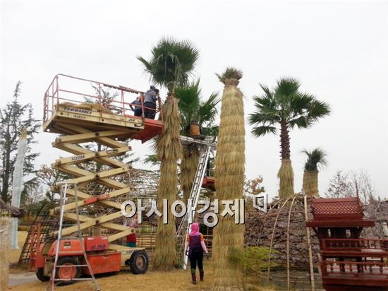 “순천만정원 내 73만9000여 주 ” [아시아경제 노해섭 기자]순천시는 최근 기상이변에 따른 겨울철 한파가 예상됨에 따라 순천만정원 및 수목원에 식재된 조경 수목에 대해 수목별 특성에 맞는 철저한 월동대책을 추진하고 있다.내년 1월말까지 추진하게 될 조경수 월동대책 대상 수목은 총73만9천여 주로 교목 1만7천여 주, 관목72만2천여 주다.월동대책은 조직위직영 조경작업단 13명 및 일시인부사역원들이 볏짚 역기 및 볏짚 싸기, 지표 왕겨피복, 퇴비주기 작업 등으로 이뤄진다.특히, 태국정원의 경우 우리지역에서 월동이 힘든 아열대수종에 대해서는 볏짚 감기를 시작으로 부직포, 비닐감기, 지면피복 등 3중으로 수목 보호 작업을 실시한다.시 관계자는 "지난해 겨울철에도 극심한 한파에 철저한 월동대책 추진으로 대한민국 최초 정원 축제인 2013순천만국제정원박람회를 성공적으로 개최할 수 있었다"면서 "올 해도 철저한 월동대책으로 건강한 수목유지 관리를 추진하겠다"고 말했다.한편, 기상청 제공 2013년 겨울철 기후 전망은 평년보다 -3~8℃ 낮거나 비슷하겠다며 대륙고기압이 평년보다 강하게 발달해 기온이 큰 폭으로 떨어질 때가 있을 것이라 하여 시는 좀 더 섬세하고 철저한 월동대책을 추진할 계획이다. 노해섭 기자 nogary@<ⓒ세계를 보는 창 경제를 보는 눈, 아시아경제(www.asiae.co.kr) 무단전재 배포금지>