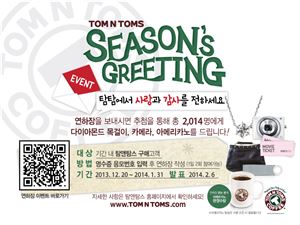 [아시아경제 이광호 기자]탐앤탐스는 연말 감사 연하장과 아메리카노를 선물하는 '시즌스그리팅 이벤트'를 진행한다고 23일 밝혔다. 탐앤탐스 시즌스그리팅 이벤트는 매장 구매 고객이라면 누구나 참여할 수 있으며, 탐앤탐스 홈페이지(www.tomntoms.com)에서 구매 영수증 하단의 행운번호를 입력하면 자동으로 응모된다. 연하장을 받는 수신자는 선착순으로 아메리카노 모바일 쿠폰이 1개 씩 동봉돼 선물된다.이제훈 탐앤탐스 마케팅기획팀 팀장은 "다양한 경품으로 연말 기분 좋은 행운을 나눌 수 있도록 이번 이벤트를 기획했다"고 말했다.이광호 기자 kwang@asiae.co.kr<ⓒ세계를 보는 창 경제를 보는 눈, 아시아경제(www.asiae.co.kr) 무단전재 배포금지>