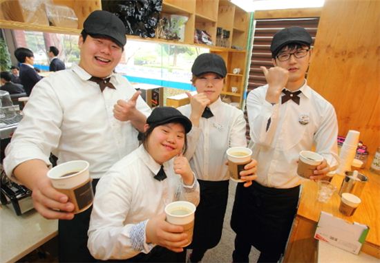 [아시아경제 고형광 기자] "지적장애를 앓는 아이가 바리스타로 당당히 일을 하고 있으니 감사한 마음 뿐입니다. 애가 일을 하면서 사교성도 좋아지고 더욱 밝고 명랑해진 듯 합니다. 아침마다 직장에 출근한다며 싱글벙글 웃으며 행복해 하는 모습을 보면 너무나 기쁩니다."김영옥(여ㆍ47) 씨는 지적장애 1급인 딸 김희경(23) 씨가 '나는카페'에 취업한 것을 대견스러워하며 이같이 말했다. '나는카페'는 발달장애 청년을 바리스타로 고용하는 사회적기업 형태의 커피전문점으로, 한국마사회가 사회공헌의 일환으로 추진 중인 사업이다. '나는카페'는 지난해 경기 안산 '1호점'을 시작으로 의정부와 구리 등 3개소가 문을 열었고 올해는 과천 한국마사회 본관과 시흥시청 등 4곳이 추가로 개설돼 총 7곳으로 늘었다. 내년엔 7곳이 추가로 문을 연다.'나는카페'의 가장 큰 장점은 발달장애 청년들에게 평생 일자리를 제공한다는 점이다. 그동안 사회적 편견으로 발당장애 청년들에게 취업은 높은 벽이었고, 취업이 된다해도 단순 노동직이 대부분이었다. 하지만 '나는카페' 7개 지점에는 20명이 넘는 발달장애 청년들이 근무하고 있다. 또 앞으로 문을 여는 카페에도 장애 청년들이 근무하게 된다. 박한용 마사회 사회공헌추진단장은 "나는카페를 통해 장애청년들에게 평생 일자리를 제공할 계획"이라며 "나는카페는 장애청년들에게 일자리를 지원하는 것만이 아니라 자신감과 새로운 희망을 준다는 데 더 큰 의미가 있다"고 말했다.◆ 발달장애 청년들의 희망 '나는카페' = '나는카페'는 마사회가 지난해 의정부 장외발매소에 바리스타 양성 교육장을 처음으로 설치ㆍ운영하면서부터 시작됐다. 이어 경기 안산, 고양, 시흥, 구리 장외발매소에서도 차례로 바리스타 교육이 시작됐다. 올해부터는 수원과 분당 장외발매소에서도 교육을 하고 있다. 지난해 한국마사회 장외발매소에서 교육을 이수한 장애인은 총 51명이다. 이 중에서 절반에 가까운 30명이 '나는 카페' 7개 지점에 채용돼 바리스타로 활동 중이거나 내년에 개소 예정인 카페에 채용될 예정이다. 올해도 50명이 넘는 학생들이 교육을 받았다.