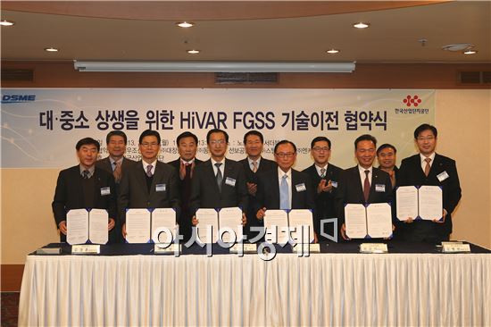 대우조선해양 전략기획실장 엄항섭 전무(왼쪽 다섯번째)와 기자재업체 대표들이 협약식 체결 후 기념촬영을 하고 있다.(사진제공=대우조선해양 )