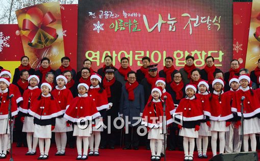 [아시아경제 백소아 기자] 크리스마스를 하루 앞둔 24일 서울 중구 서울광장에서 열린 '전 금융권과 함께하는 아름다운 나눔 전달식'에서 최수현 금융감독원장을 비롯한 금융권 인사들이 역사어린이합창단과 캐롤을 부르고 있다.(앞줄 왼쪽부터 윤용로 외환은행장, 신충식 농협은행장, 이건호 우리은행장, 박종덕 구세군사령관, 최 금감원장, 김필수 구세군 서기장관, 이순우 우리은행장, 서진원 신한은행장, 김종준 하나은행장, 하영구 씨티은행장)백소아 기자 sharp2046@asiae.co.kr<ⓒ세계를 보는 창 경제를 보는 눈, 아시아경제(www.asiae.co.kr) 무단전재 배포금지>