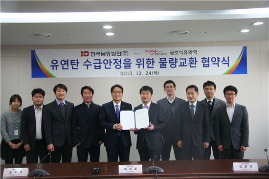 [아시아경제 김혜원 기자] 한국남동발전(사장 허엽)은 지난 24일 서울 삼성동 본사에서 이용재 조달그룹장과 고영도 금호석유화학 상무 등 관계자가 참석한 가운데 금호석유화학과 유연탄 물량 교환 협약을 맺었다고 26일 밝혔다.남동발전은 4개 석탄화력발전소에서 연간 2400만t의 석탄을 필요로 한다. 내년 영흥 5, 6호기 준공과 2018년 영흥 7, 8호기 건설 시 연간 3000만t 이상의 석탄을 도입해야 하는 석탄 구매의 '큰 손'이다.금호석유화학은 1997년 열병합발전소로 에너지 사업에 진출해 현재 집단에너지 사업자로서 여수 산업단지 내에 2개의 발전소를 운영 중이다.여수 산단 내에 위치한 남동발전의 여수화력발전처와 금호석유화학의 열병합발전소는 각각 연간 120만t, 70만t의 유연탄을 사용하고 있다. 양사는 유연탄 수급 비상 상황 시 유연탄을 물량 교환하는 내용의 협약을 맺은 것이다.이번 협약 체결은 유연탄 공급 환경의 불가항력적인 외생변수(기상이변, 예상치 못한 사고 등)로 인해 발생 가능한 수급 불안의 위험성에 대처할 수 있는 기반이 될 것으로 보인다.김혜원 기자 kimhye@asiae.co.kr<ⓒ세계를 보는 창 경제를 보는 눈, 아시아경제(www.asiae.co.kr) 무단전재 배포금지>