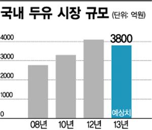 [아시아경제 이광호 기자] 매년 두 자릿수 이상의 높은 성장세를 보이던 두유(豆乳) 시장이 올해 마이너스 성장을 기록할 전망이다. 소비부진과 주요 판로인 대형마트에 대한 영업규제로 성장성이 크게 둔화되고 수익성이 악화됐기 때문이다. 27일 관련 업계에 따르면 올해 두유 시장 규모는 3800억원에 그칠 전망이다. 이는 전년(4100억원) 대비 8%가량 감소한 수치다.두유 시장은 2004년 2520억원, 2006년 2600억원, 2008년 2770억원, 2010년 3300억원, 2012년 4100억원으로 매년 꾸준한 성장을 이뤄왔다. 그러나 이 같은 인기도 불황의 그늘을 피하지는 못했다.두유업계 관계자는 "당초 올해 두유 시장 규모가 4500억원에 달할 것으로 예상됐으나, 불황과 정부의 대형마트 영업규제로 매출이 크게 줄었다"며 "대형마트에서 판매되는 두유 매출이 전체 매출의 50% 이상을 차지하고 있어 휴점 시 타격이 불가피한 상황"이라고 말했다. 다만 두유업계에서는 "웰빙 트렌드로 인해 식물성, 저가공 자연식품인 두유에 대한 소비자의 선호도가 증대되고 콜레스테롤 개선, 골다공증·비만 예방 두유의 건강 유용성에 대한 소비자들의 인식 확산으로 두유 시장의 규모가 다시 확대될 긍정적인 요인이 있다"고 보고 있다. 지금 상황은 트렌드에 맞는 다양한 제품 개발은 물론 마케팅에 공을 들여야하는 시기라는 것이다. 이를 위해 정식품은 전통적인 두유 음용층인 중장년층뿐 아니라 20∼30대 젊은 소비자에게도 통하는 다양한 신제품을 출시한다는 계획이다. 또 간편하게 마시는 두유부터 커피, 제빵, 요리 등 식품의 원료, 요리까지 두유의 활용 범위를 확대할 예정이다.삼육식품, 매일유업, 남양유업 등도 소비 시장이 활력을 찾을 수 있도록 다양한 방안을 강구하고 있다.AC닐슨 기준 두유 시장은 베지밀 등 히트상품을 생산·판매하는 정식품이 44%의 시장점유율을 기록하고 있고 삼육식품(22%), 남양유업(10%), 매일유업(8%), 연세우유(5%), 롯데칠성(2%) 등이 뒤를 잇고 있다.이광호 기자 kwang@asiae.co.kr<ⓒ세계를 보는 창 경제를 보는 눈, 아시아경제(www.asiae.co.kr) 무단전재 배포금지>