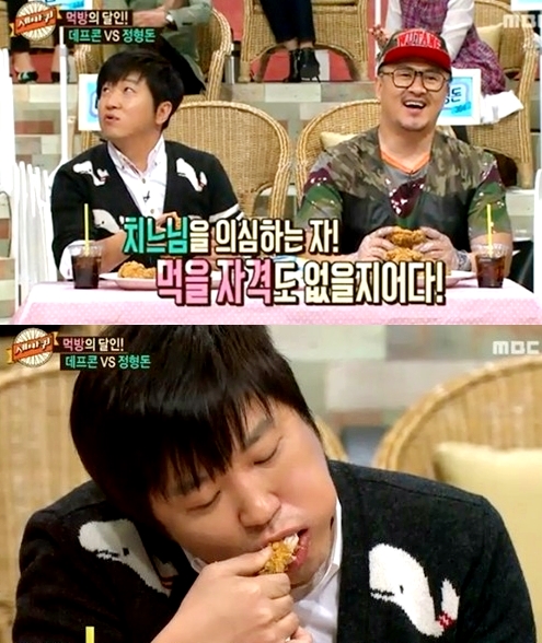 [아시아경제 이금준 기자]정형돈과 데프콘이 독특한 '치킨 먹방'으로 눈길을 끌어다.정형돈과 데프콘은 28일 밤 방송한 MBC '세상을 바꾸는 퀴즈'(이하 세바퀴)에 출연해 '먹방 대결'을 펼쳤다. 이들은 편의점 음식과 대게에 이어 치킨에도 도전했다.치킨을 대하는 두 사람의 스타일은 사뭇 달랐다. 정형돈은 "절임 무도 먹지 않는다"면서 치킨을 향한 '무한 애정'을 보인 것.특히 정형돈은 "잘 튀겨졌는지, 혹시 피가 있지는 않은지 알아보기 위해 한번 꺾는다"는 데프콘을 향해 "치느님 의심하는 자. 먹을 자격도 없다. 내 피라 생각하고 먹어라"라 말해 웃음을 자아냈다.한편, 이날 '세바퀴'서는 정형돈과 데프콘 외에도 가희, 소유, 김학도, 배한성 등이 출연해 입담을 과시했다.이금준 기자 music@asiae.co.kr<ⓒ세계를 보는 창 경제를 보는 눈, 아시아경제(www.asiae.co.kr) 무단전재 배포금지>