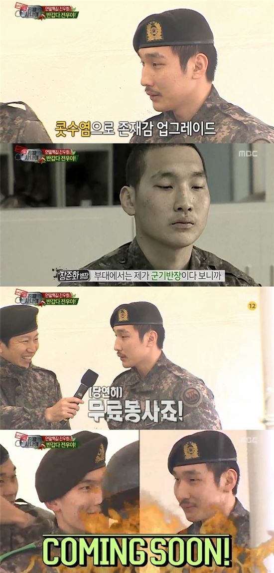 [아시아경제 유수경 기자]'진짜 사나이' 장준화 상병이 제대 후 다시 한 번 방송에 출연해 눈길을 모았다.29일 오후 방송된 MBC '일밤-진짜 사나이'에서는 '연말특집 전우회' 편이 그려졌다.이날 이종격투기 선수 출신의 장준화는 머리와 콧수염을 기른 채 등장했다. 그는 자신의 인상이 너무 착해서 수염을 길렀다고 밝혀 웃음을 자아냈다.이미 제대를 해 군인의 신분이 아닌 장준화는 "사실 내가 음주가무를 안 한다. 팥빙수 먹으며 얘기하는 것을 좋아한다"고 자신의 거친 이미지에 대해 해명했다. 그는 "제대 후에 일을 하다가 운동하면서 동네 순찰하고 있다"며 "어디 불 난 데 있나 하고 살펴본다. 무료 봉사 중이다"라고 말하며 입담을 과시했다.한편 이날 장준화는 보디빌더 출신 설민호 상병과 씨름 한판 승부를 벌였다.유수경 기자 uu84@asiae.co.kr<ⓒ아시아경제 & 스투닷컴(stoo.com)이 만드는 온오프라인 연예뉴스>