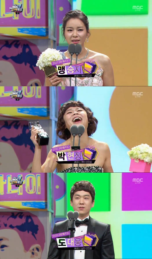 [아시아경제 장영준 기자]개그우먼 맹승지 박현정과 개그맨 도대웅이 각가 '2013 MBC 방송연예대상'에서 코미디 부문 신인상을 수상했다.29일 오후 8시 45분 서울 영등포구 여의도 MBC에서 생방송으로 진행된 '2013 MBC 방송연예대상' 시상식에서 맹승지 박현정 도대웅이 코미디 부문 수상자로 호명돼 무대에 올랐다.맹승지는 수상 직후 "오늘 신인상 못 받을 것 같아서 엄마 아빠 오지 말라고 그랬는데, 미안하다. 그리고 저를 MBC 공채 개그맨으로 뽑아주신 국장님 감독님께 감사드린다"며 "선배님들과 감독님, 그리고 '섹션TV' 가족들에게도 감사드린다"고 소감을 전했다.공동 수상한 박현정은 "엄마, 나 신인상 받았어. 사실 맹승지를 먼저 불러서, 공동 수상 없다고 하길래 못 받는 주 알았다. 그런데 이렇게 받아서 당황스럽다"며 "국장님 감독님 다 감사드린다. 감사한 분들이 많은데 기억이 안 난다. 19기 동기들 정말 사랑한다"고 말했다.남자 부문에서 신인상을 수상한 도대웅은 자신의 유행어로 잠시 긴장감을 없앤 뒤, "내년에는 더욱 열심히 하겠다. 솔직히 수상할 줄 몰라 소감을 준비하지 못했다. 사실 박명수 선배님이 제가 상 받을 거라 귀띔해 줘서 지금 감흥이 없다. 하지만 그대를 하고 있었다. 감사드린다"며 "엄마에게 감사드린다. 그리고 국장님 감독님들께도 감사드린다. 그리고 우리 19기 항상 사고만 쳤는데, 늘 우리 편에 서주신 함효주 선배님께 이 영광 돌리겠다"고 밝혔다.한편 김수로 김구라 소이현이 진행을 맡은 '2013 MBC 방송연예대상' 시상식은 화려한 게스트들의 축하무대와 올 한해 MBC 예능을 빛낸 스타들이 한 자리에 모여 의미를 더했다.장영준 기자 star1@asiae.co.kr<ⓒ세계를 보는 창 경제를 보는 눈, 아시아경제(www.asiae.co.kr) 무단전재 배포금지>