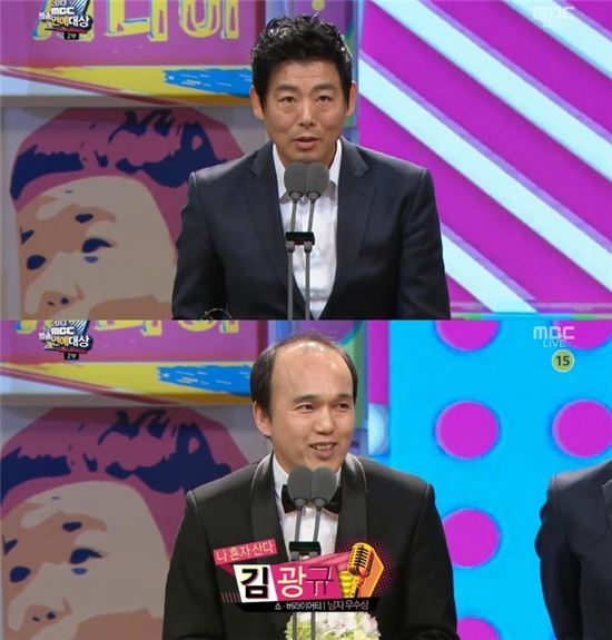 [아시아경제 유수경 기자]배우 성동일과 김광규가 쇼 버라이어티 부문 우수상을 수상했다.29일 밤 서울 영등포구 여의도 MBC에서는 MBC '방송연예대상' 시상식이 개최됐다. 이날 '아빠 어디가'의 성동일과 '나 혼자 산다' 김광규는 쇼 버라이어티 부문 우수상을 수상해 무대에 올랐다.성동일은 "즐겁지만 힘든 여행이었는데 다섯 아이들에 고맙다. 어린 자식들 등 떠밀어 돈 버는 것 같아 정말 죄송하다"며 "제작진들 고맙다. 사실 이름을 다 못 외운다. 아이들에게 이 상을 주겠다"며 트로피를 들어 올렸다.김광규는 "멤버들에겐 혼자 살라 하고 PD가 자기는 쌍둥이 엄마가 됐다"며 "제작진들에게 고맙다. 작가 언니들 내가 꼭 시집 보내겠다"고 말해 웃음을 자아냈다.그는 이어 "예능감 부족한데도 늘 나와서 도와주신 어머니, 구로동 브래드 피트 작은 형 감사하다"며 "올 초 3월에 전세 사기 재판이 끝났다. 재판에서 패소해서 매일 울었다. 13년 동안 번 돈 한 번에 날려서 전화위복을 외쳤다. 감사하다"고 덧붙였다.올해 시상식은 김구라, 소이현, 김수로가 진행을 맡았으며, 한 해 동안 시청자들에게 사랑받았던 MBC 예능 프로그램들이 명예의 대상을 놓고 치열한 대결을 펼친다.이날 최고 인기 프로그램상 후보에는 '나 혼자 산다' '라디오 스타' '무한도전' '세바퀴' '아빠 어디가' '우리 결혼했어요 시즌4' '진짜 사나이' 등 총 7개 프로그램이 이름을 올렸다.또 축하무대로는 박명수의 DJ무대와 김구라의 '구라용팝' 등 다양한 볼거리들이 준비됐다. 현재 'G-Park'이라는 이름으로 DJ활동을 펼치고 있는 박명수는 이번 무대를 위해 바쁜 일정 속에서도 틈틈이 준비해왔다.유수경 기자 uu84@asiae.co.kr<ⓒ아시아경제 & 스투닷컴(stoo.com)이 만드는 온오프라인 연예뉴스>