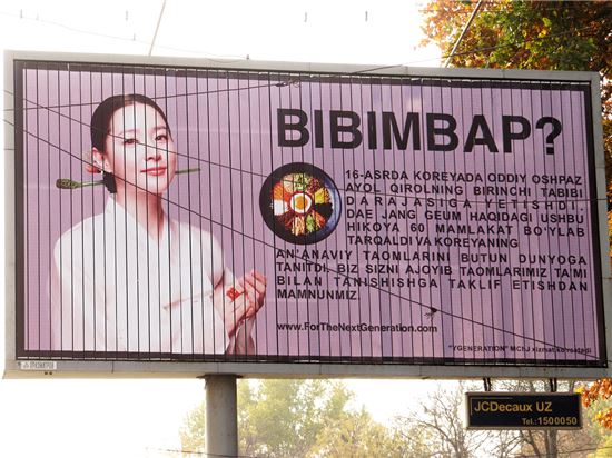 [아시아경제 장영준 기자]이영애 비빔밥 광고가 뉴욕타임스(NYT)에 이어 우즈베키스탄 타슈켄트 중심가에 게재됐다.한국 홍보 전문가 서경덕 성신여대 교수가 우즈베키스탄 타슈켄트 중심가에 이영애 비빔밥 광고를 올렸다고 30일 밝혔다.이번 대형 비빔밥 빌보드 광고는 가로 6미터, 세로 3미터로 타슈켄트 중심가 쇼핑센터 거리에 올렸으며 지난 3월 중국 상해 패션몰에 올린 대형 빌보드 광고 이후 2번째 옥외 광고다.지난 여름 타슈켄트를 방문한 서 교수는 "현재 우즈베키스탄 및 카자흐스탄 등 중앙아시아와 중동지역에 한류 바람이 거세다. 특히 중앙아시아는 고려인들도 많이 거주하는 지역이라 한국문화를 알릴 수 있는 좋은 조건이다"고 전했다.또한 서 교수는 "1인당 국민소득이 약 1800달러에 불과한 우즈베키스탄 젊은이들에게 한국계 기업에 취직하는 것이 큰 꿈이다. 이런 상황에서 우리의 한식을 널리 알릴 수 있는 좋은 기회라 판단하여 광고를 올렸다"고 덧붙였다.지난 5년간 NYT, WSJ, 뉴욕 타임스스퀘어, 런던 피카딜리서커스 등 세계적인 주요 언론 및 관광지에 한식 광고를 지속적으로 올려왔던 서 교수는 올해 초 태국 파타야시 막걸리 광고를 시작으로 '한식광고 월드투어'를 하는 중이다.이에 대해 서 교수는 "올해는 특히 한류스타인 배우 이영애와 김윤진이 한식 광고모델을 재능기부 해 줘서 세계적인 유력지에 게재할 수 있었다. 그 후 같은 광고파일을 활용하여 전 세계 주요 도시 빌보드 광고를 계속 올리고 있는 중이다"고 말했다.특히 서 교수는 "지금까지는 미주,유럽지역에 많은 한식 홍보를 해 왔다. 하지만 이번부터는 중앙아시아,중동,아프리카 지역으로 더 확대해 나가는 첫발이며 카자흐스탄 알마티, 이집트 카이로 등에도 곧 올릴 계획이다"고 밝혔다.한편 서 교수는 지금까지 비빔밥, 막걸리, 김치 등을 한식광고의 소재로 집중해 왔으나 내년부터는 불고기, 갈비 등으로 더 확대해 나갈 예정이다.장영준 기자 star1@asiae.co.kr<ⓒ세계를 보는 창 경제를 보는 눈, 아시아경제(www.asiae.co.kr) 무단전재 배포금지>