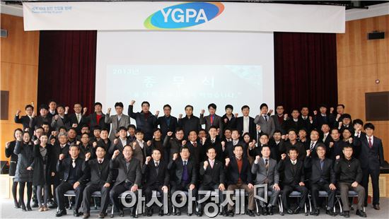 31일 월드마린센터에서 열린 2013년 여수광양항만공사 종무식에서 권종수 사장 직무대행(가운데)이 해양수산부 장관 표창을 받은 천철웅 부장(왼쪽), 권규하 대리(오른쪽)와 기념촬영을 하고 있다.