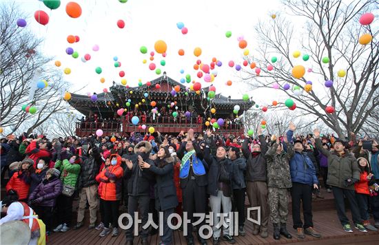 [아시아경제 이진택 기자]전남 구례군은 1일 오전 7시부터 구례 봉성산에서 서기동 구례군수를 비롯한 직원들과 주민들이 함께한 가운데 갑오년 새해 소망과 건강을 기원하는 해맞이 행사를 가졌다. 참석자들이 희망의 풍선을 하늘높이 날리고 있다.