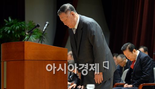 [아시아경제 최우창 기자]정몽구 현대기아자동차그룹 회장이 2일 서울 서초구 현대자동차 양재동 사옥에서 열린 2014년도 시무식에 참석, 신년사를 전하기 전에 직원들 앞에서 인사를 하고 있다.최우창 기자 smicer@asiae.co.kr<ⓒ세계를 보는 창 경제를 보는 눈, 아시아경제(www.asiae.co.kr) 무단전재 배포금지>