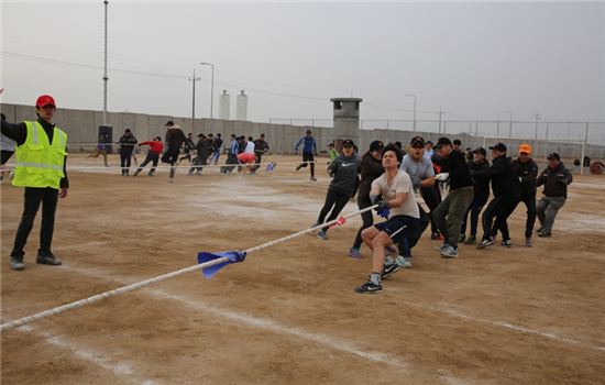한화건설이 지난 1일 연말연시를 맞아 이라크 비스마야 건설공사 현장 근로자들을 위해 신년체육대회를 열었다고 3일 밝혔다. 사진은 한화건설 이라크 비스마야 현장의 임직원들이 체육대회에서 전략줄다리기를 하는 모습이다.