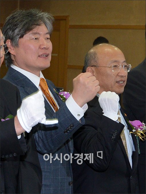 [아시아경제 윤동주 기자] 3일 서울 용산구 대한의사협회에서 열린 '2014년 의료계 신년하례회'에 참석한 문형표 보건복지부 장관(오른쪽)과 노환규 대한의사협회장이 파이팅을 외치고 있다.윤동주 기자 doso7@asiae.co.kr<ⓒ세계를 보는 창 경제를 보는 눈, 아시아경제(www.asiae.co.kr) 무단전재 배포금지>