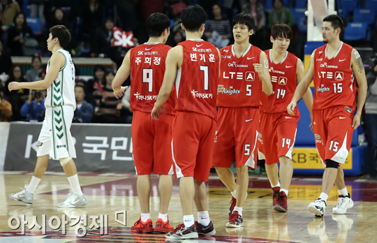 [아시아경제 정재훈 기자] 3일 오후 서울 잠실학생체육관에서 열린 KB국민카드 2013~2014 프로농구 SK와 동부의 경기. 73:71 역전승을 거두며 단독 선두로 올라선 SK 선수들이 기쁨을 나누고 있다.정재훈 기자 roze@asiae.co.kr<ⓒ세계를 보는 창 경제를 보는 눈, 아시아경제(www.asiae.co.kr) 무단전재 배포금지>