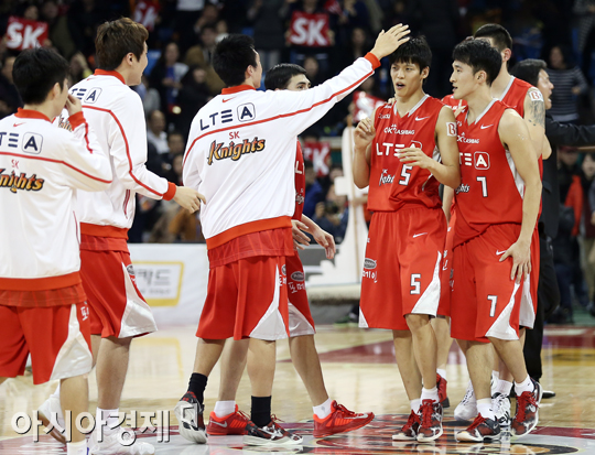 [아시아경제 정재훈 기자] 3일 오후 서울 잠실학생체육관에서 열린 KB국민카드 2013~2014 프로농구 SK와 동부의 경기. 73:71 역전승을 거두며 단독 선두로 올라선 SK 선수들이 기쁨을 나누고 있다.정재훈 기자 roze@asiae.co.kr<ⓒ세계를 보는 창 경제를 보는 눈, 아시아경제(www.asiae.co.kr) 무단전재 배포금지>