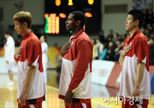 [안양=아시아경제 정재훈 기자] 4일 오후 안양실내체육관에서 열린 KB국민카드 2013~2014 KGC와 삼성의 경기. KGC의 새 외국인 선수 맥키네스가 국민의례를 하고 있다. 정재훈 기자 roze@asiae.co.kr<ⓒ세계를 보는 창 경제를 보는 눈, 아시아경제(www.asiae.co.kr) 무단전재 배포금지>