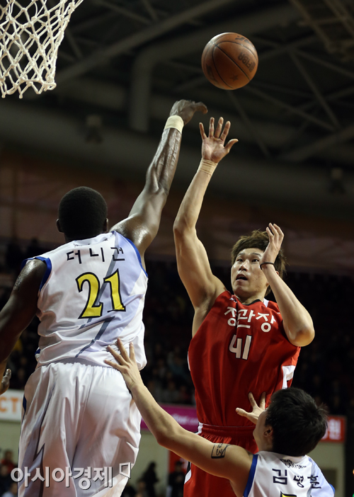 [안양=아시아경제 정재훈 기자] 4일 오후 안양실내체육관에서 열린 KB국민카드 2013~2014 KGC와 삼성의 경기. 삼성 더니건이 KGC 오세근의 슛을 블로킹하고 있다. 정재훈 기자 roze@asiae.co.kr<ⓒ세계를 보는 창 경제를 보는 눈, 아시아경제(www.asiae.co.kr) 무단전재 배포금지>