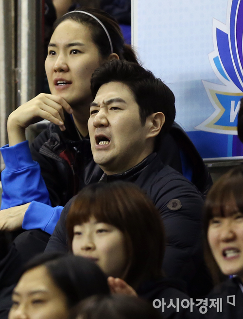 [춘천=아시아경제 정재훈 기자] 5일 오후 강원도 춘천 호반체육관에서 열린 우리은행 2013∼2014 여자프로농구’ 올스타전. 우리동네 예체능 연예인 농구팀과 WKBL 레전드팀의 오프닝 경기에서 탤런트 한상진이 박정은의 플레이를 지켜보고 있다. 정재훈 기자 roze@asiae.co.kr<ⓒ세계를 보는 창 경제를 보는 눈, 아시아경제(www.asiae.co.kr) 무단전재 배포금지>