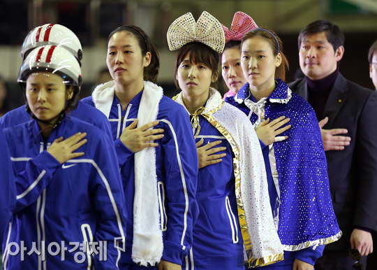 [춘천=아시아경제 정재훈 기자] 5일 오후 강원도 춘천 호반체육관에서 열린 우리은행 2013∼2014 여자프로농구’ 올스타전. 남부선발 김단비가 머리에 리본을 쓰고 국민의례를 하고 있다. 정재훈 기자 roze@asiae.co.kr<ⓒ세계를 보는 창 경제를 보는 눈, 아시아경제(www.asiae.co.kr) 무단전재 배포금지>