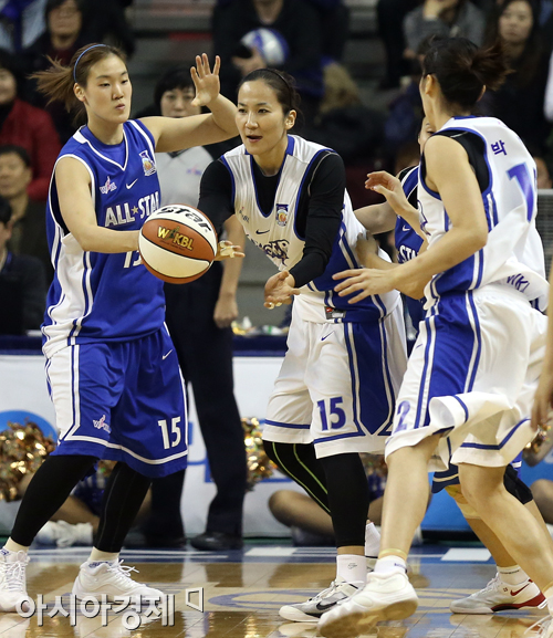 [춘천=아시아경제 정재훈 기자] 5일 오후 강원도 춘천 호반체육관에서 열린 우리은행 2013∼2014 여자프로농구’ 올스타전. 중부 선발 신정자가 패스를 건네고 있다. 정재훈 기자 roze@asiae.co.kr<ⓒ세계를 보는 창 경제를 보는 눈, 아시아경제(www.asiae.co.kr) 무단전재 배포금지>